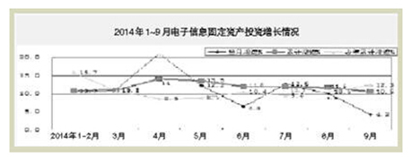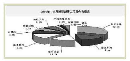 2014年1~9月,電子信息產業固定資產投資持續呈趨緩態勢,電子器件行業投資持續回落,家用視聽和信息材料等領域投資仍下滑,電子元件、計算機和通信行業投資增速放緩,新開工項目依然不足。主要特點如下: