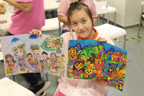 現(xiàn)場(chǎng)的活動(dòng)里,先是開展了有趣的按指令畫畫小熱身環(huán)節(jié)。隨后,主持人向大家展現(xiàn)了孩子們一幅幅美妙的繪畫作品,有的構(gòu)圖新穎,有的色調(diào)優(yōu)美,有的畫風(fēng)細(xì)致……每一幅畫,都蘊(yùn)藏著孩子們對(duì)社會(huì)的感受,以及對(duì)美好生活的向往和祝福。精彩的畫作,加上主持人妙語連珠的講解,使得現(xiàn)場(chǎng)變成一片歡樂的海洋。