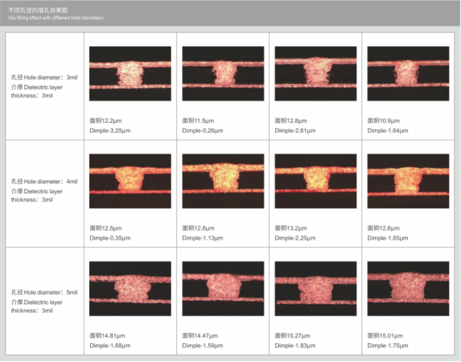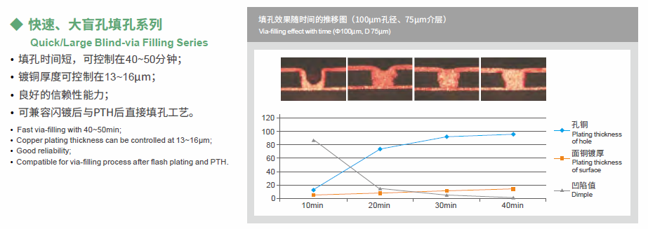VFP series is a new generation of via-filling solution which also apply to VCP equipment, with high speed blind hole filling capacity suitable for hole diameter of 2~6mil and thinner surface copper, it’s fully applied for the production of fine lines, high current, high through hole plating, as well as simultaneously through hole and blind hole plating meanwhile through hole have good corner throwing power.